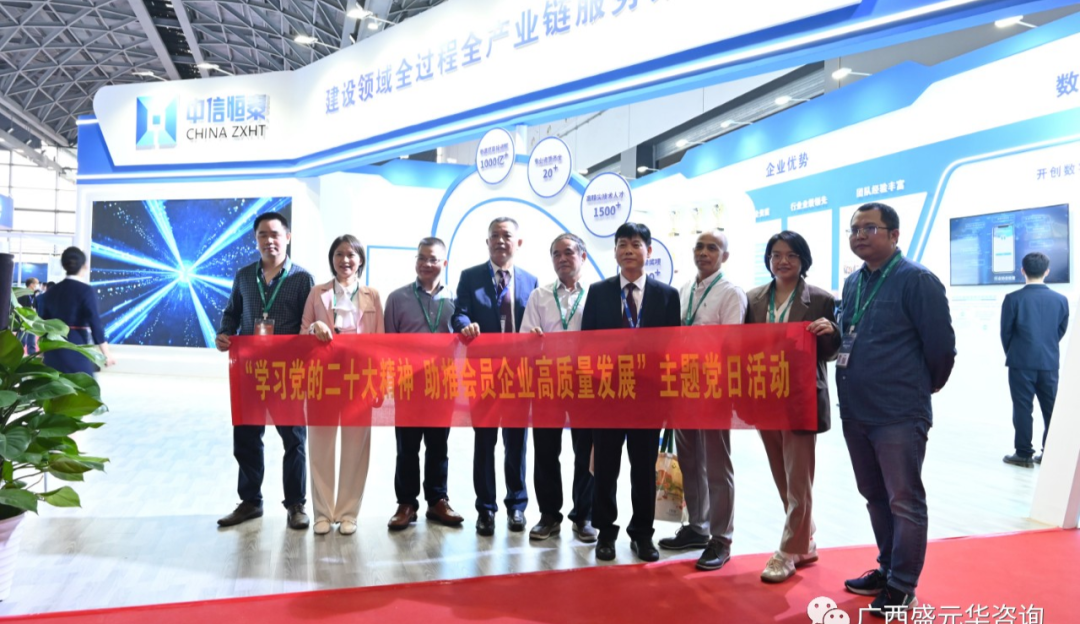 公司領(lǐng)導(dǎo)及公司黨支部成員與廣西建設(shè)工程造價(jià)協(xié)會黨支部在觀展期間進(jìn)行了黨建活動交流并集體合影