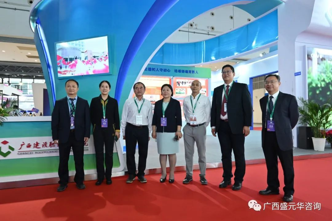 公司領(lǐng)導(dǎo)參觀了廣西建設(shè)職業(yè)技術(shù)學(xué)院展位并與校黨委書記劉曉紅、校長吳昆等貴賓們合影